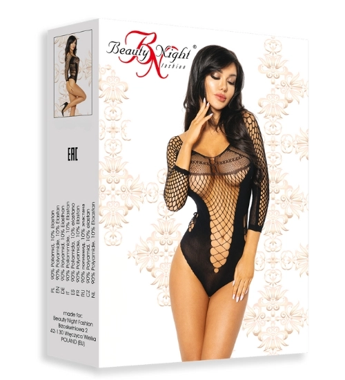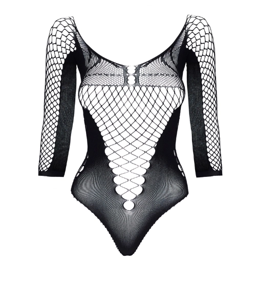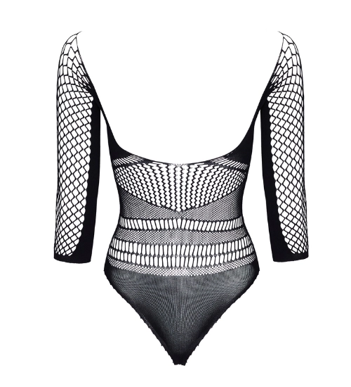 Vzor kabaretky s efektními průstřihy přitahuje pozornost a jemně odhaluje tělo, zatímco hluboký výstřih a odkrytá záda dodávají modelu výjimečný charakter. Zadní část body zvýrazňuje zadeček, čímž vytváří harmonické spojení smyslnosti a elegance. Celek působí velmi atraktivně a je ideální volbou pro romantické chvíle nebo speciální příležitosti.