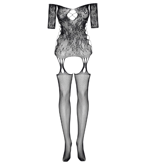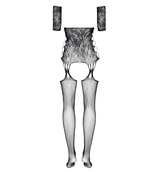 Elastický materiál zajišťuje dokonalé přizpůsobení, díky čemuž prádlo vypadá skvěle na každé postavě. Krátké rukávy jemně zakrývají ramena a svůdné boční rozparky s křížovým prošíváním odhalují boky, čímž vytvářejí mimořádně svůdný efekt. Celý model doplňují integrované punčochy, které podtrhují smyslný charakter tohoto kousku.
