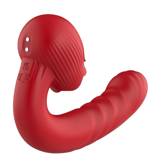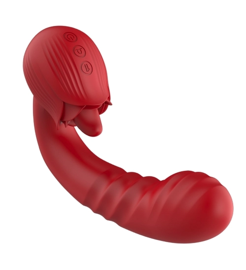 Červený vibrátor na bod G s jazýčkem spojuje intenzivní vnitřní i vnější stimulaci v jednom zařízení. Tvarovaný shaft masíruje bod G a pevný jazýček dráždí klitoris rytickým pohybem nahoru a dolů. Konstrukce umožňuje souběžné používání obou funkcí, díky čemuž vibrace, posuvný pohyb a práce jazýčku vytvářejí propojený, víceúrovňový zážitek.