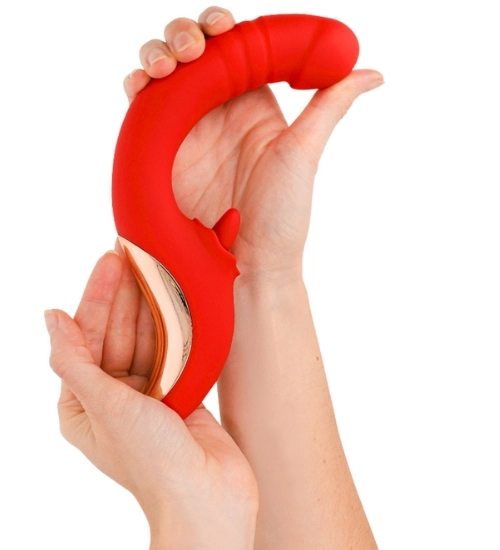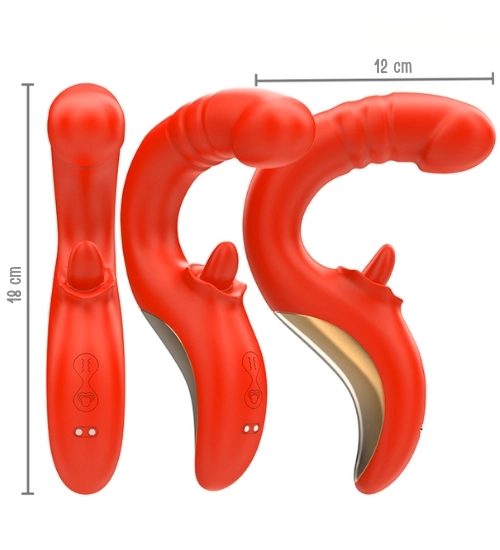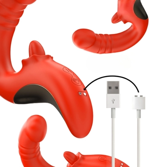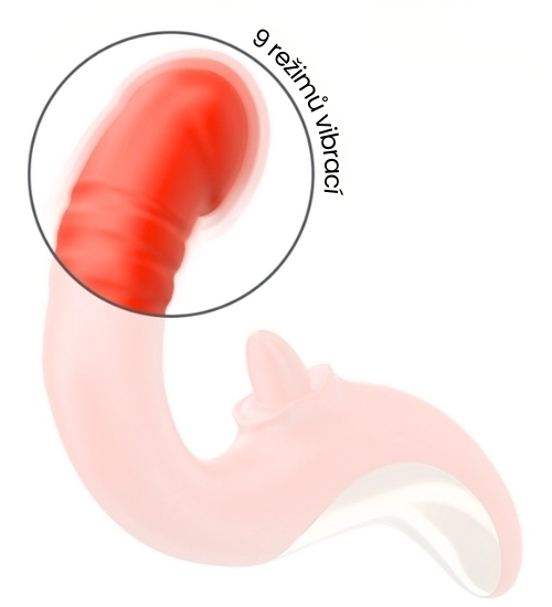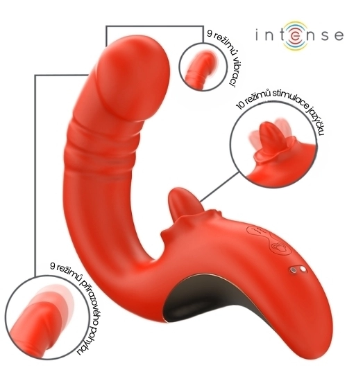 Červený vibrátor s pohyblivým jazykem nabízí intenzivní pocity interní i externí. Dva nezávislé motory jsou zodpovědné za duální stimulaci: jeden ovladač vibrace a pohyby nahoru a dolů část, která masíruje bod G, a druhou část, která uvádí do pohybu jazyk výroba kruhové pohyby v tolika 10 režimů. Díky tomu je každý okamžik s touto pomůckou jedinečný smyslný a plný potěšení.