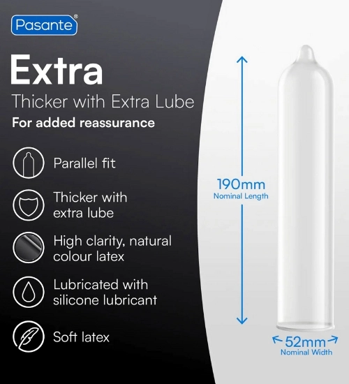 Pasante Extra jsou bez spermicidních látek, alkoholu a živočišných složek. Certifikace CE a elektronické testování garantují jejich spolehlivost. Extra lubrikace v kombinaci s pevnou konstrukcí z nich dělá volbu, která spojuje bezpečnost s vyšší rozkoší.