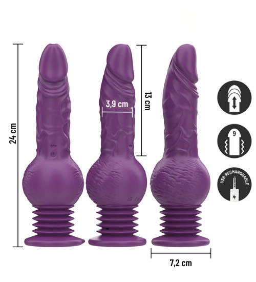 Fialový vibrátor zaujme realistickým tvarem a moderním systémem posuvného pohybu, který věrně napodobuje přirozené pocity intimity. Nabízí tři úrovně rychlosti pohybu nahoru–dolů a až devět režimů intenzivních vibrací, které účinně stimulují bod G a zaručují nezapomenutelné chvíle rozkoše. Je napájen vestavěným akumulátorem, který poskytuje delší provoz a silnější vibrace než modely na klasické baterie.