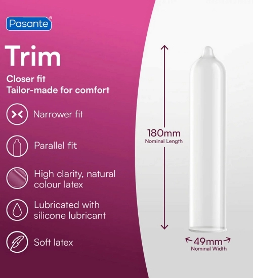 Kondomy Pasante Trim se vyznačují užší jmenovitou šířkou – 49 mm, což zajišťuje lepší přizpůsobení pro ty, kteří hledají pevnější a stabilnější usazení. Díky tomu poskytují nejen pocit bezpečí, ale i vyšší komfort při intimních chvílích.
