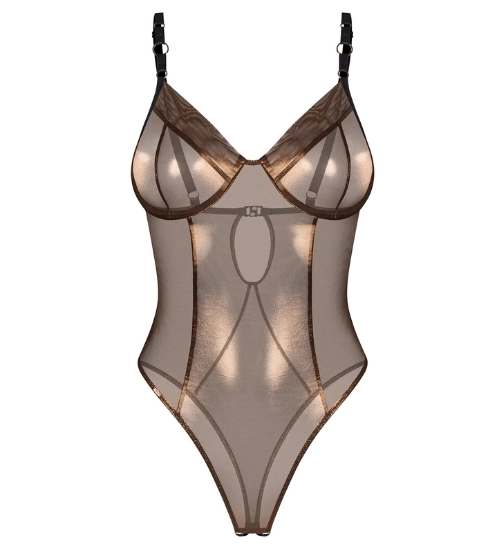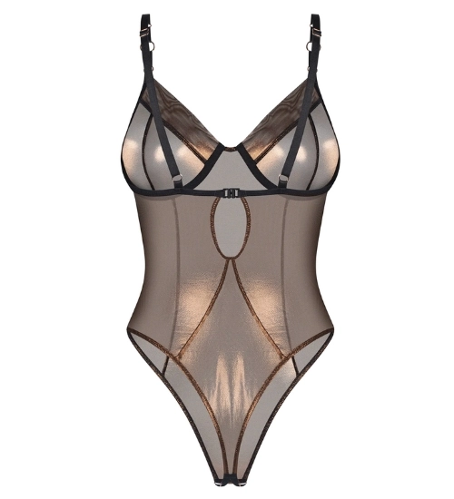 Lesklé body s otevřeným rozkrokem vytváří mimořádně svůdný efekt díky poloprůhledné síťovině v mosazném odstínu. Materiál jemně září a krásně se přizpůsobuje postavě, což zvýrazňuje její linie elegantním a zároveň odvážným způsobem. Všité kostice tvarují poprsí a dodávají mu lákavější vzhled. Nastavitelná ramínka umožňují snadné přizpůsobení délky. Celek tvoří okouzlující, ženský model, který spojuje lehkost látky s výrazným, moderním stylem.