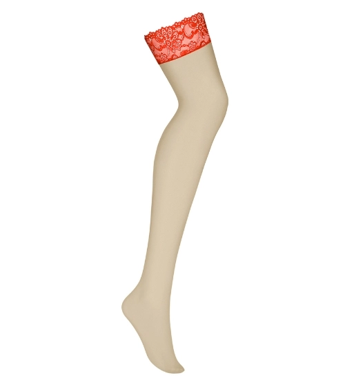 Spojení béžové síťky a červené krajky na stehnech vytváří efekt připomínající podvazky. Tento kontrast barev krásně zvýrazňuje linii nohou a působí mimořádně svůdně. Materiál se dokonale přizpůsobí postavě, takže punčochy vypadají velmi atraktivně v nejrůznějších stylových kombinacích.