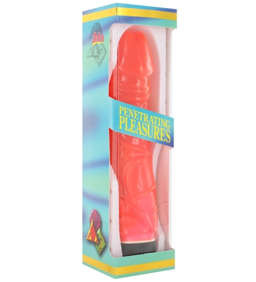 Vibrátor z červené gelové hmoty. Příjemný materiál k použití ještě více umocňuje pocit. Jeho masitá struktura klamně připomíná skutečný mužský úd.