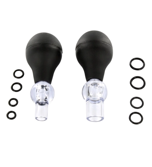 Okořeňte své milostné hry! Sada pro zvětšení bradavek. Skládá se ze dvou čerpadel - většího a menšího. Dvě různé velikosti umožňují přizpůsobit otvor čerpadla velikosti vsuvky. Sada navíc obsahuje čtyři páry gumových kroužků, které podporují otok.