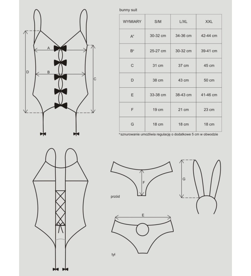 Šněrovaná záda navíc umožňují snadné přizpůsobení trička vašim potřebám. Punčochy zdůrazňují nohy sexy způsobem. Kalhotky s jemným ocáskem a zaječími ušima dodávají celému vzhledu hravý charakter .