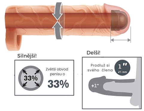 Překrytí vám umožní prodloužit váš člen o 2,5 cm a zvětšit jeho obvod o 33 % . Partnerovi díky němu poskytnete intenzivní a hluboký průnik a zbavíte se svých komplexů.