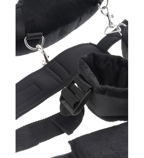 Pro kompletní bondage sada obsahuje hmatová pouta, která jsou pomocí karabinek připevněna k měkkému plyšovému obojku. Díky nim si můžete být jisti, že vaše milovaná osoba během erotických hrátek nevyklouzne.