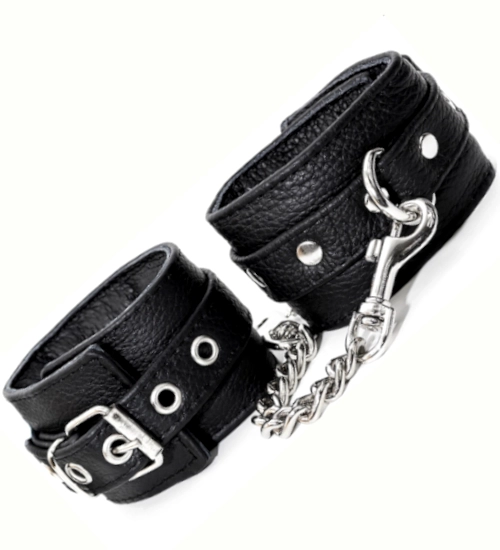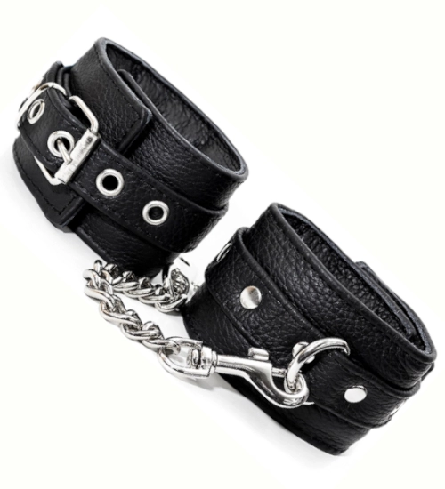 Pevně vyrobené okovy z nejkvalitnější hovězí kůže . Pouta jsou černá , což jim dodává jedinečnou eleganci. Jsou spojeny pevným řetízkem s karabinkou na konci .