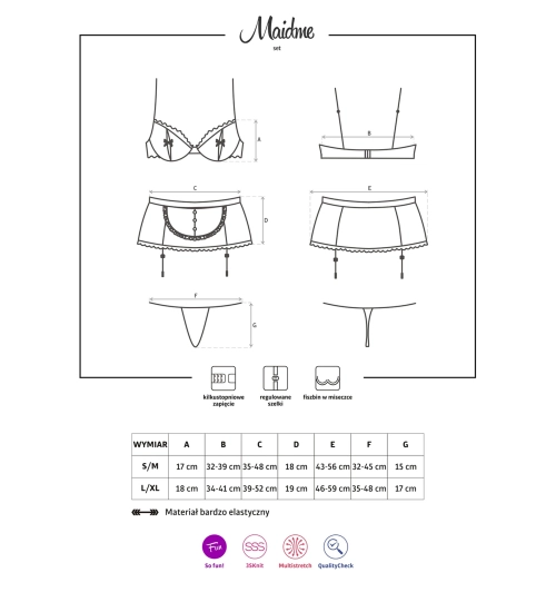 Sada se skládá ze svůdného podvazkový pás s hravou zástěrou, dokonale zvýrazňuje hýždě. Sada navíc obsahuje podprsenku, krásně podpůrná prsa. Díky nastavitelné velikosti si ji můžete libovolně přizpůsobit svým potřebám.
