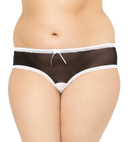 Kalhotky z jemné prolamované tkaniny. Kalhotky jsou zdobené bílým krajkovým volánkem, který krásně kontrastuje s tmavou barvou kalhotek. Uprostřed je ozdobný prvek, bílá mašle s růží.