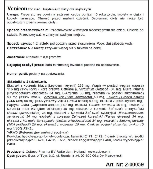 Složení tablet je velmi dobře zvoleno a zvoleno pro zvýšení síly a trvání erekce . Venicon pro muže je jedním z nejoblíbenějších a nejúčinnějších přírodních přípravků na erekci. Přípravek byl vyvinut holandskou společností Cobeco Pharma, její produkty jsou na evropském trhu vysoce ceněny a vyznačují se velmi vysokou účinností.