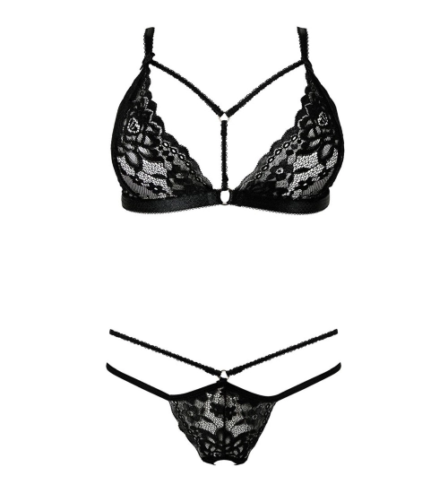 Černá krajková souprava spodního prádla sestávající z krásné podprsenky a kalhotek. Květinový motiv tvarovaných šálků působí dojmem éterické a pomíjivé atmosféry. Pozornost upoutají tenká ramínka spojená se zbytkem podprsenky obručemi a mašličkami. Nastavitelné popruhy a obvod pro pohodlné nošení.