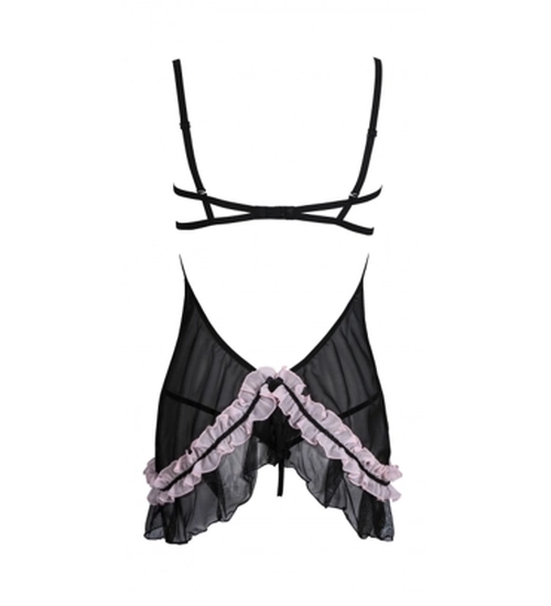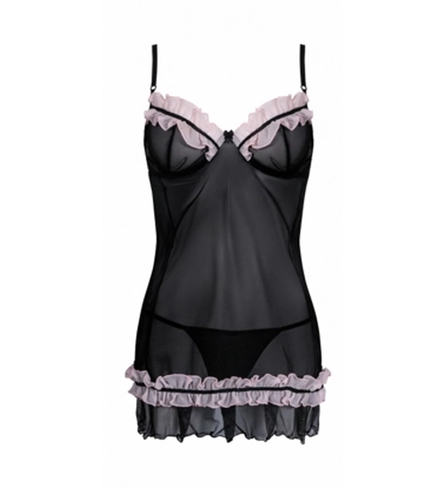 Do černé barvy se přidává sladkost s prvky pudrově růžové volánky, které jsou velmi dívčím návrhem. Pohodlné šálky na poprsí jsou zakončeny tenkými ramínky a diskrétním zapínáním na zadní straně. Na zadní straně lístku je hravý výřez, která zvýrazňuje hýždě a celek je doplněn o dravými tangy. Výrobek je k dispozici pouze ve velkých velikostech, takže dámy plné lásky získají velmi pohodlné prostředí pro své velmi atraktivní a pohledné půvaby.