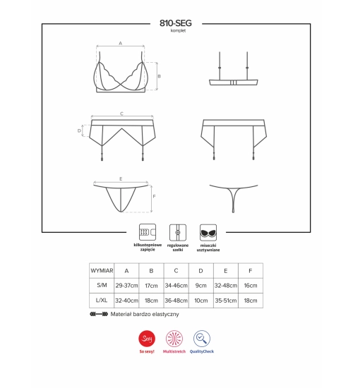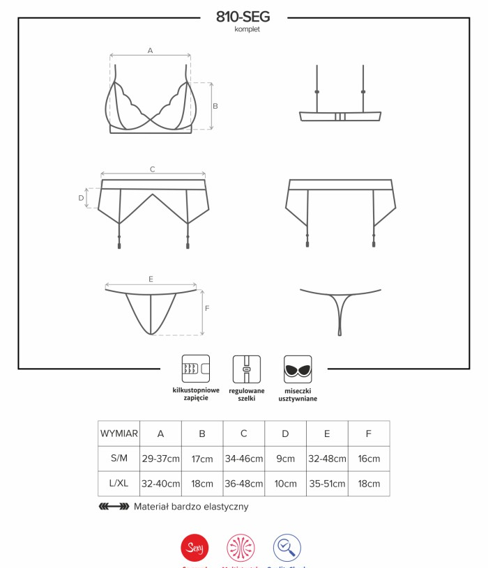 Soupravu tvoří měkká podprsenka zdobená krajkou , krásně tvarovaný pásek s nastavitelnými podvazky a krajková tanga . Všechny prvky jsou velmi elegantní a zdůrazňují ženskost . Slaďte je s bílými punčochami a nikdo vám neodolá!