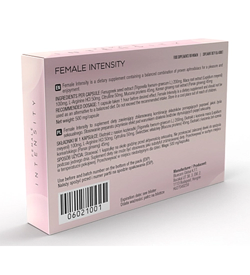 Perfektně vybrané ingredience pocítíte rozdíl již po první dávce přípravku. Užívání kapslí obden upevňuje výsledky, vaše libido bude trvale vyšší a konečně si začnete užívat styk s partnerem. Female Intensity je bezpečný přípravek podporující ženské libido, založený na přírodních složkách, které nezpůsobují vedlejší účinky. Využijte šetřící sílu přírody ke zlepšení kvality svého života.