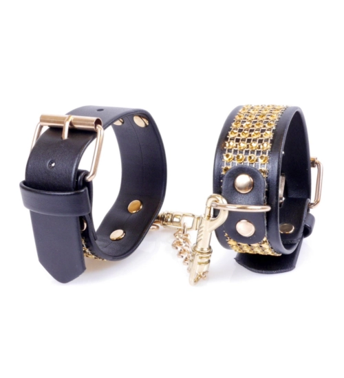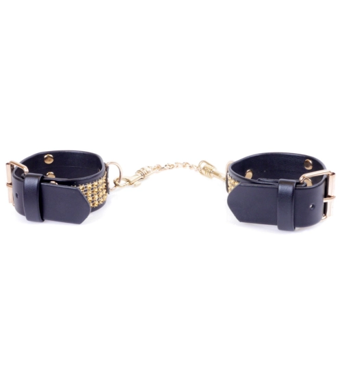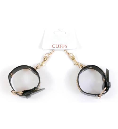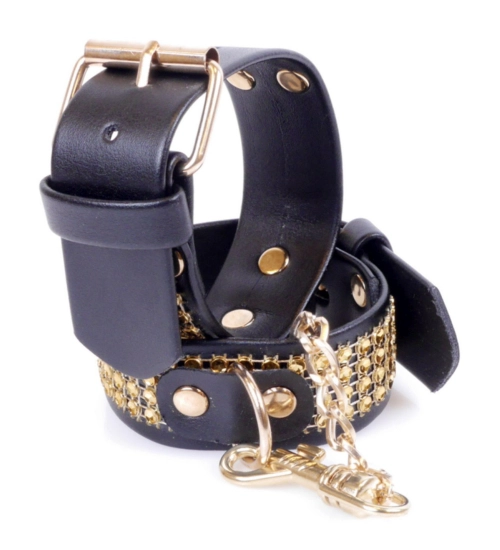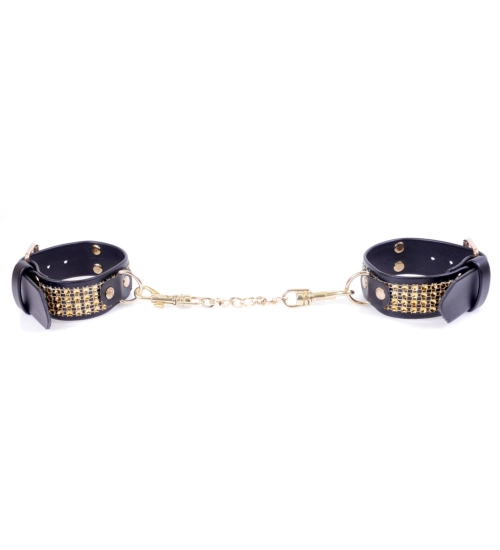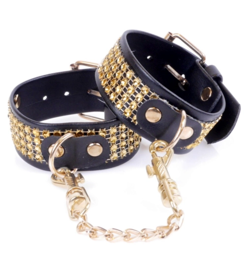 Pouta jsou vyrobena z měkkého materiálu připomínajícího umělou kůži. Jsou zdobeny zlatými flitry pro potěšení oka. Mají nastavitelnou sponu , díky které si nastavíte tlak a tím i koření . Nemají visací zámek, takže se nemusíte bát, že při hraní ztratíte klíč! Jsou spojeny ozdobným řetízkem s karabinkami zlaté barvy.