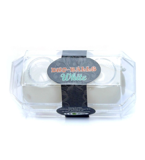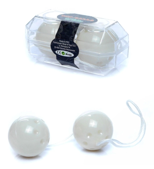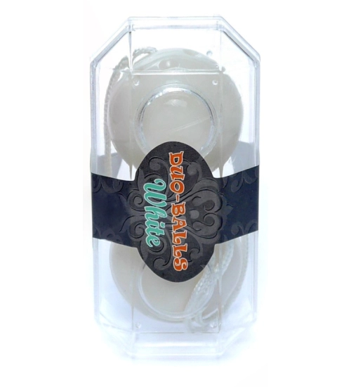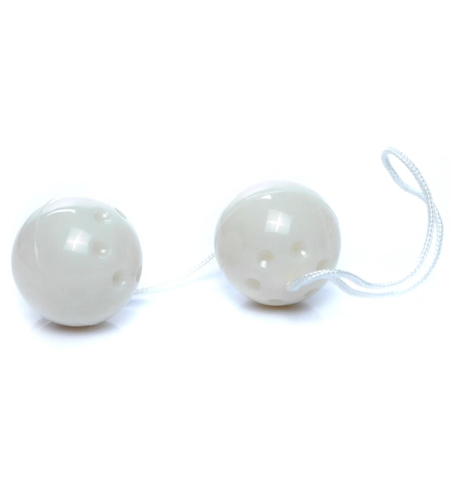 Vkusné míčky z bílého, na dotek příjemného, tělu bezpečného materiálu spojeného provázkem zvyšujícím komfort používání Vám pomohou posílit svaly pánevního dna.