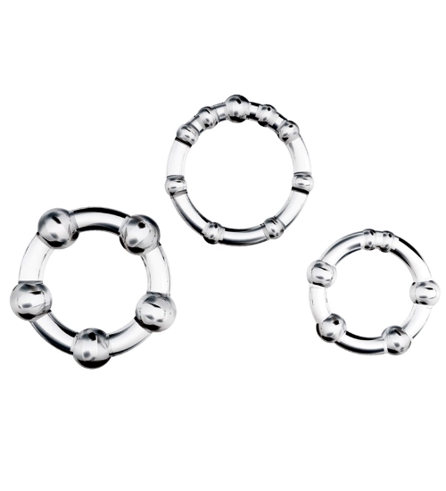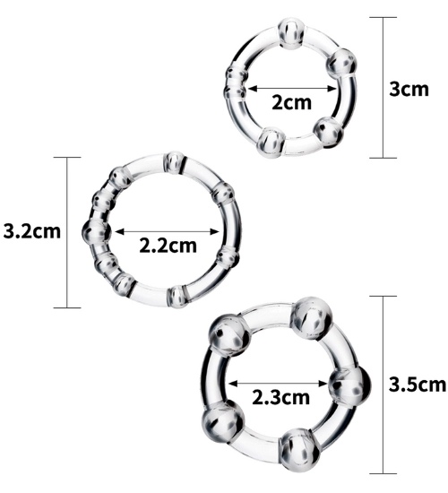 Kroužky jsou velmi pružné a hladké, takže se snadno přizpůsobí velikosti penisu. Můžete je nosit odděleně - na penisu nebo varlatech nebo všechny najednou a pocítit skutečné potěšení ze sexu.
