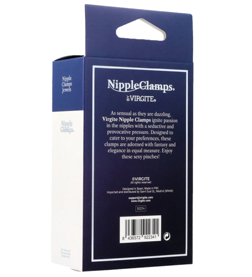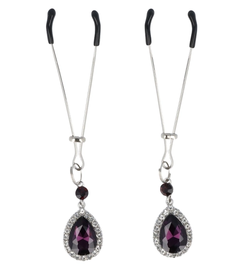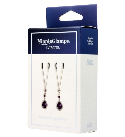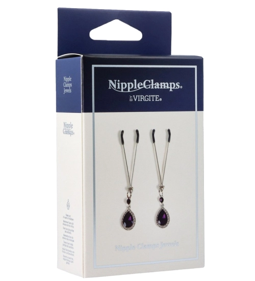 Svorky na bradavky od společnosti Virgite, jemně stimulují citlivou pokožku bradavky a krásně zdobí poprsí. Jsou zdrojem potěšení i smyslnou ozdobou. Klipy jsou vyrobeny z bezniklového kovu v krásné stříbrné barvě. Kleště jsou navíc kryté měkkým povlakem polyuretan, aby klipy nedráždily pokožku a byly příjemné a pohodlné na nošení. Svorky se dodávají s elegantními přívěsky - fialovou slzou obklopenou zirkony. Díky jednoduché konstrukci svorek jsou klipy se přizpůsobí jakékoliv velikosti bradavek.