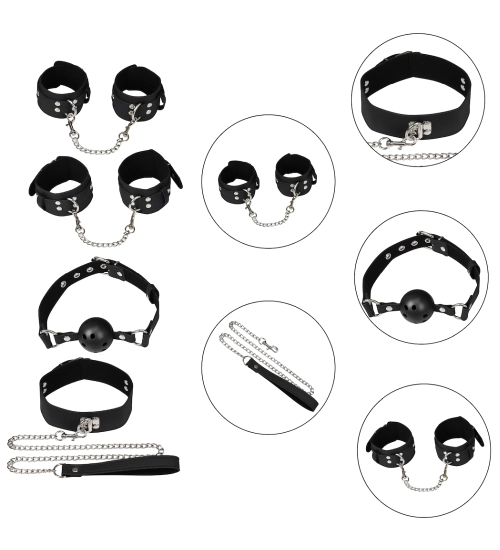 Kompletní sada BDSM určená k prozkoumání nové dimenze intimity. Ideální pro pro začátečníky i zkušené nadšenci. Obsahující pět pečlivě vytvořených doplňků, které obohatí váš erotický život o nezapomenutelné pocity. Každý kus je vyroben ve vysoké kvalitě, materiály bezpečné pro pokožku, což zajišťuje nejen vzrušující zábavu, ale také pohodlí a bezpečnost při používání. Plná kontrola a všestrannost pro každou fantazii.