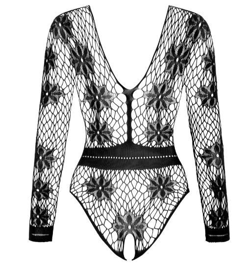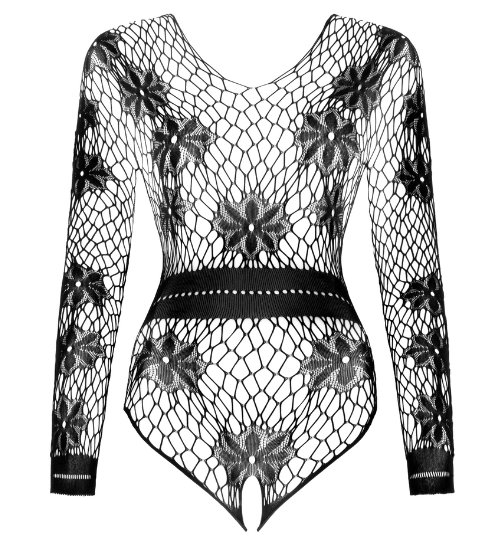 Síťované body Regina s dlouhými rukávy je nabídkou pro milovníkyodvážného a elegantního stylu. Vyrobeno z jemné černé síťoviny zdobené květinovým vzorem, spojuje jemnou smyslnost s propracovaným designem. Dlouhý rukáv a hluboký výstřih na zádech dodávají eleganci a vytvářejí působivou kompozici, která přitahuje pozornost i zdůrazňuje ženskou siluetu.
