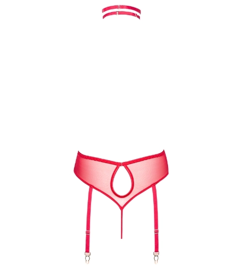 Soubor se vyznačuje tím, že odpovídajícím chokerem, která dokonale splývá s tělem a vytváří harmonický a výrazný celek. Tento pozoruhodné příslušenství ještě více zvýrazňuje stylizaci smyslný a nevyžaduje žádnou další výzdobu. Zadní část body svádí s plně odhalenými zády a tanga, která odhaluje hýždě a okořenit celý. Vysoce kvalitní, elastický materiál zajišťuje pohodlné nošení a dokonale se přizpůsobuje tělu, takže je ideální volbou pro výjimečné večery.