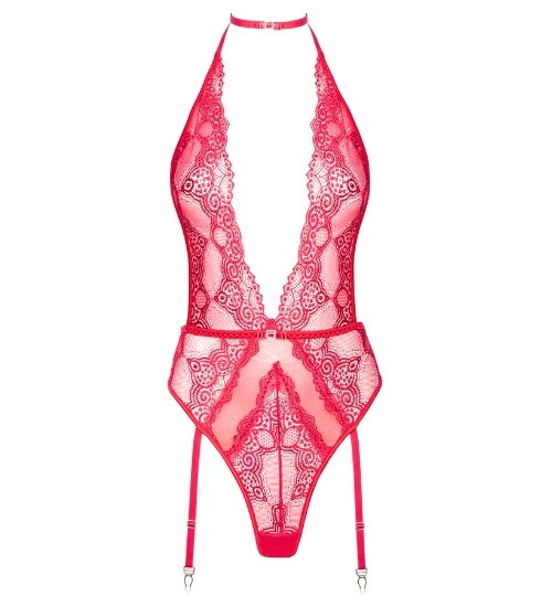 Toto červené krajkové body je určeno pro milovníky stylu s luxusní povrchovou úpravou se setkává s osobitým charakterem. Model zaujme hluboký výřez v přední části a krajkovými detaily, které přispívají k jeho romantické kouzlo. Poutavým prvkem je lesklá aplikace v pase imitace opasku - jemný akcent, který zvýrazňuje siluetu a přináší do stylingu nádech půvabu nádech glamouru.