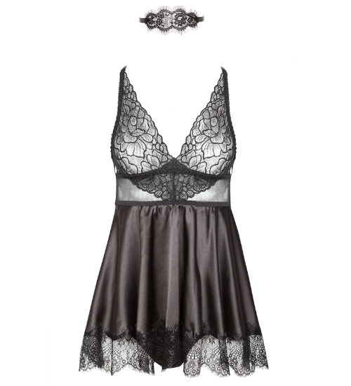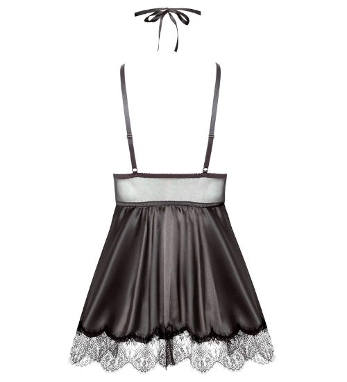 Černá, krajka a satén - kombinace, která kraluje ve světě módy smyslného spodního prádla. Tato třídílná souprava je harmonickou kombinací klasiky a elegance moderním šarmem. Košile přitahuje pozornost svým lesklým saténem a jemnou krajkou na poprsí. Nastavitelné popruhy umožňují dokonalé přizpůsobení, zvýraznění tvarů a dodání ženského půvabu.