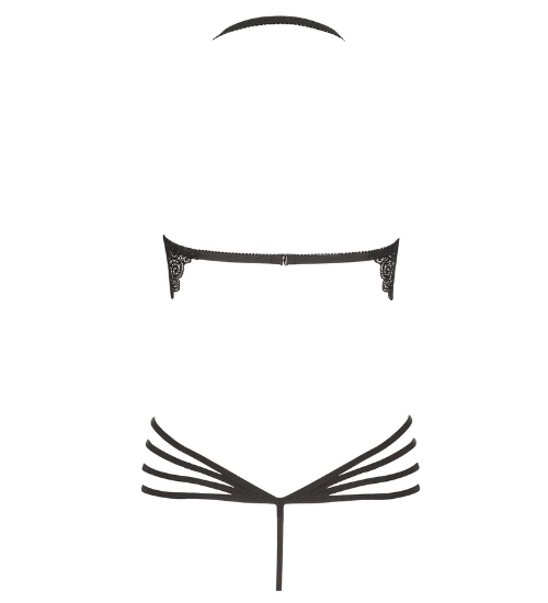 Košíčky jsou vyztuženy velrybími kosticemi, které poskytují poprsí správnou oporu. Uprostřed je malá saténová mašlička - jednoduchá, ale přesto účinný doplněk. Ramínka obepínající boky vytvářejí zajímavé uspořádání, které ještě více zvýrazňuje toto spodní prádlo a upoutává pozornost.