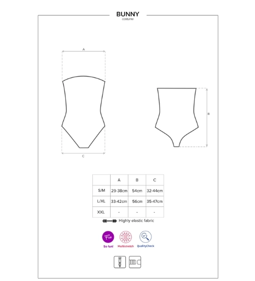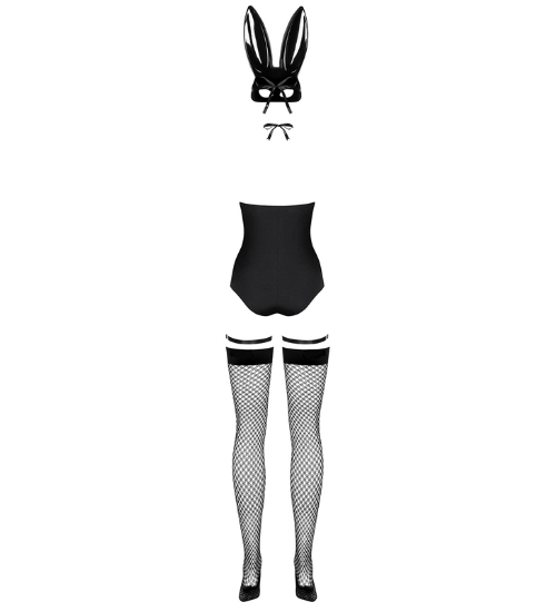 Kompletní s obsahuje vše, co potřebujete k vytvoření ucelené kreace: masku s ušima zavázanýma vzadu, odpovídající body, škrtidlo, podvazky a kabaretní punčochy. Celek je tvořen strečové tkaniny zaručuje pohodlí po celou noc.