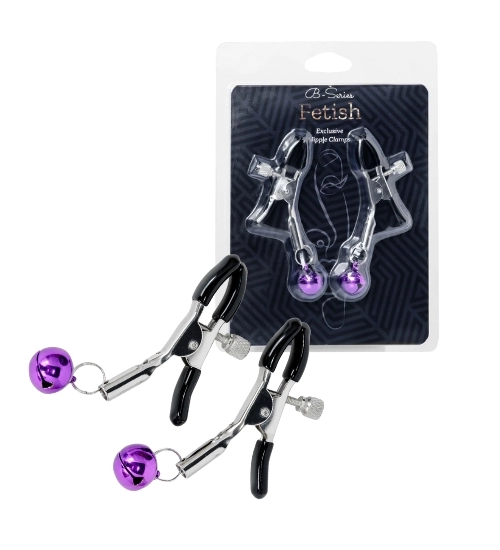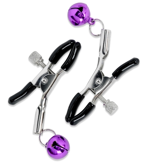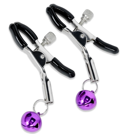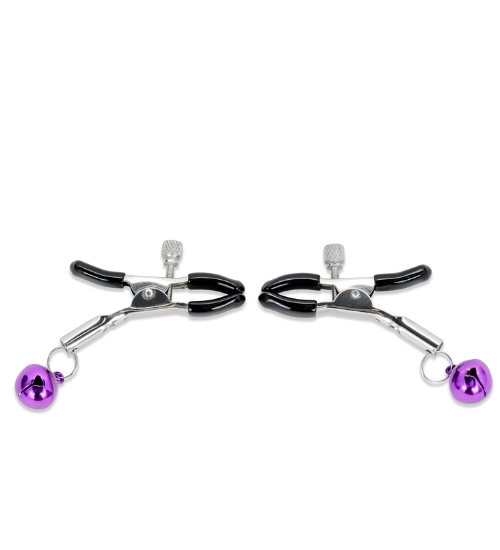 Kovové klipy s fialovými zvonky jsou perfektní dokonalý doplněk k vášnivé předehře. Jejich robustní kovové konstrukce v kombinaci s měkkou, černou gumovými podložkami poskytuje pohodlí při nošení a výrazný vzhled na těle. Klipy jsou zakončeny fialovým zvonečkem, která nejen zdobí, ale také stimuluje smysly jemný zvuk při každém pohybu.