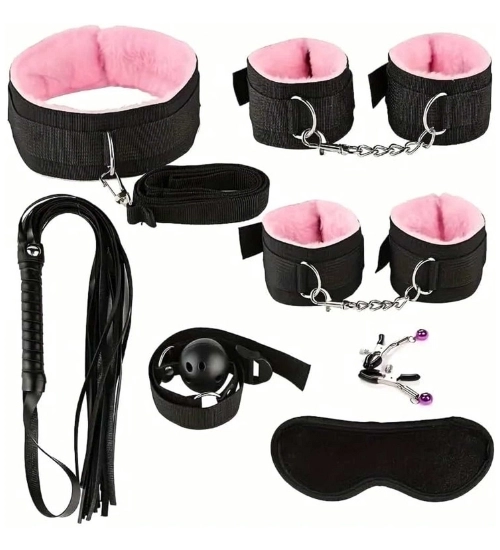 - obsahuje: obojek s vodítkem, pouta na ruce a nohy, roubík, bičík, pásku přes oči a svorky na bradavky