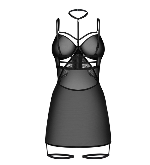 Pruhovaná síťovaná košilka kombinuje eleganci a smyslnost moderním způsobem. Čirý materiál jemně zahaluje tělo, jemně krajka pod poprsím dodává půvab a měkké košíčky s kosticemi krásně zdobí tvarují prsa a dát jim lákavý tvar. Celek je doplněn ozdobným chokerem s nastavitelným popruhem, který přitahuje pozornost a.. zvýrazňuje výstřih a ramena, vytvoření efektu plného intrik.