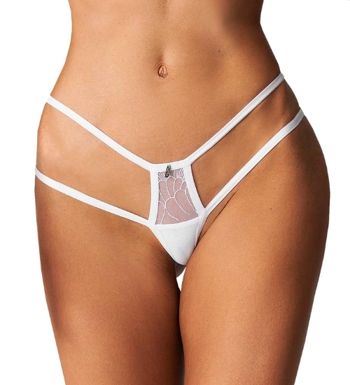Bílá tanga s vyšívanou krajkou kombinují odvážný charakter s nádechem sofistikovanosti. Průhledný panel s výšivkou a jemná krajka podtrhují jejich eleganci, zatímco ramínka obepínající tělo dodávají prádlu na eleganci zajímavý výraz. Je to model stvořený pro svádění.