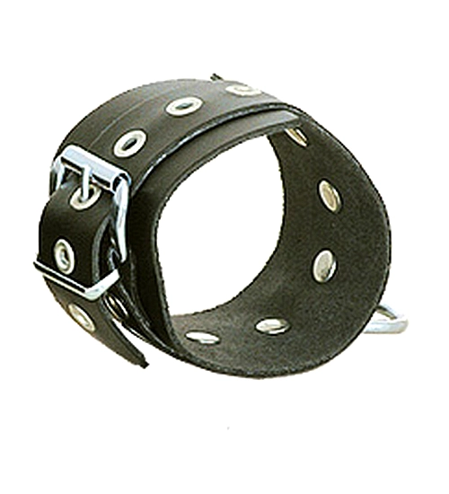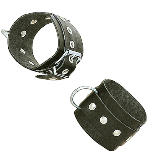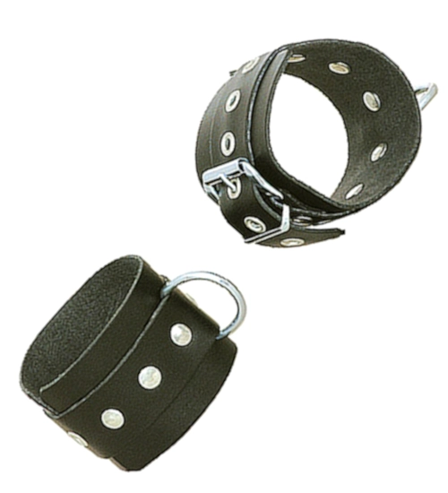 Robustní pouta na nohy z hovězí kůže v černé barvě. Pro dosažení maximálního bondage efektu jsou vyztuženy kovovými půlkruhy, nýty a navíc spojeny řetízkem.