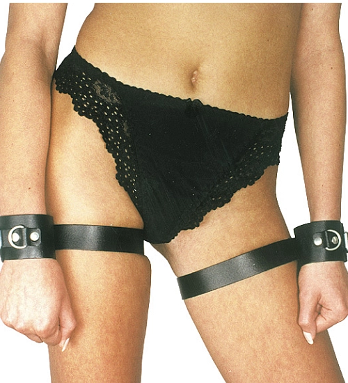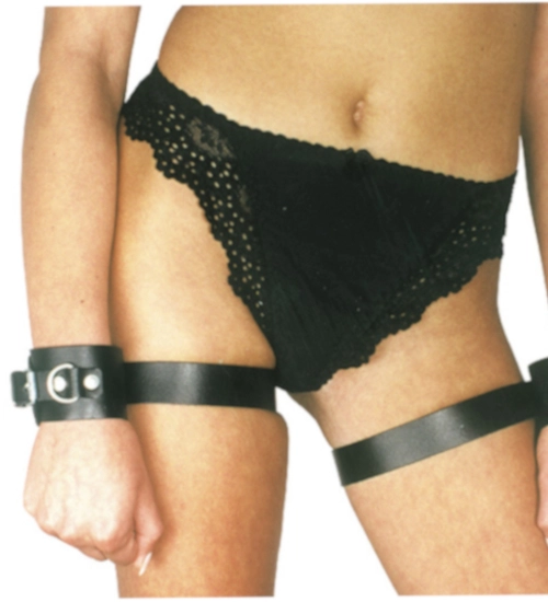Černá kožená pouta , která vám umožní omezit partnera. Speciální upevňovací prvky vám umožní svázat vaši milovanou tak, že zápěstí jsou vedle stehen. To vám umožní splnit všechny erotické touhy, o kterých jste vždy snili.