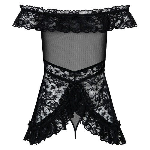 Koketní erotická košilka. Je vyroben z látky příjemné na dotek, která smyslně obepíná tělo. Má velmi smyslný květinový vzor a smyslný střih.