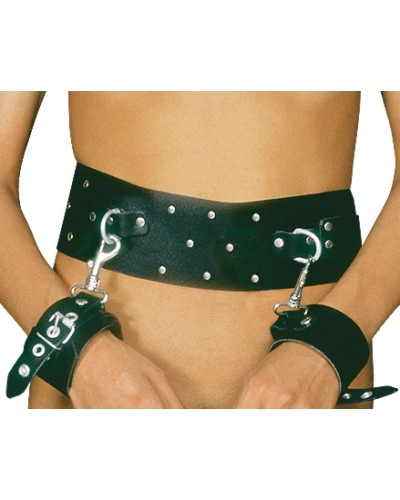 Velmi pevná otrocká sada vyrobená z nejkvalitnější hovězí kůže. Skládá se z širokého opasku zdobeného kovovými zámky a koženými pouty s karabinkami. Konstrukce spojovacích prvků umožňuje pohodlné přizpůsobení produktu vlastní velikosti. Velikost vhodná pro osoby od S do XL .